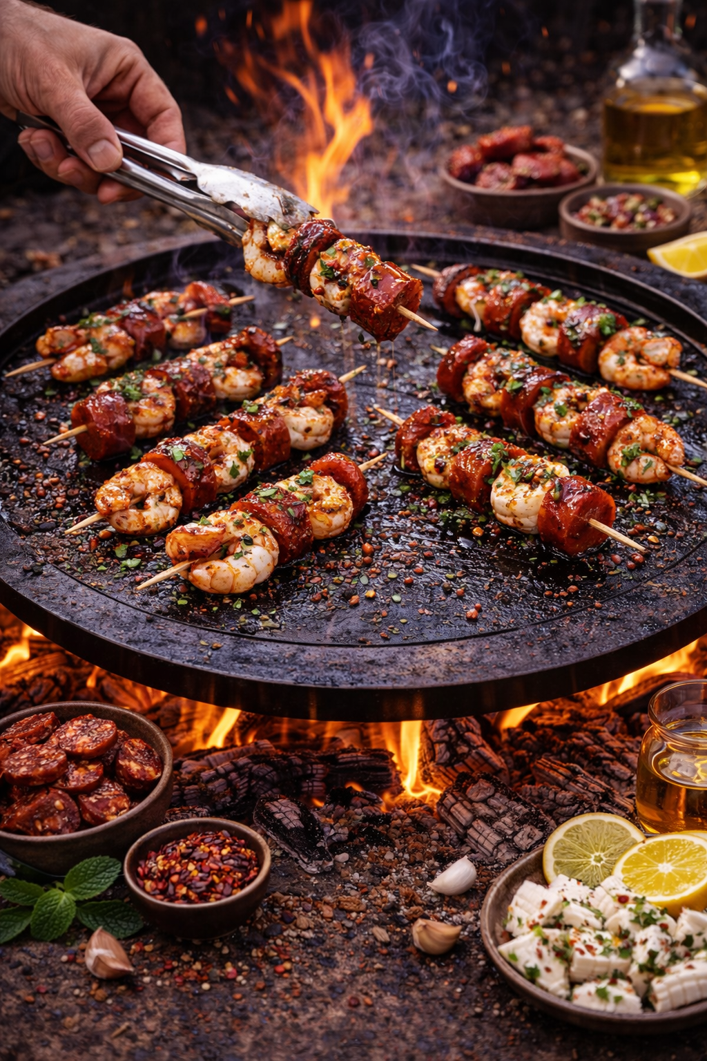 Brochettes de crevettes et au chorizo au brasero plancha